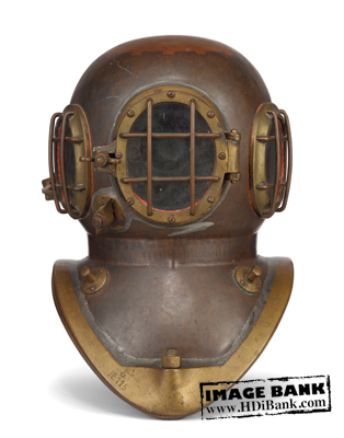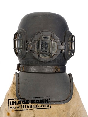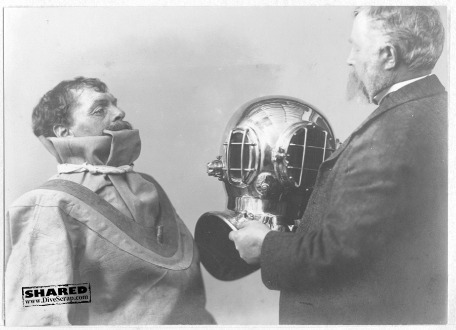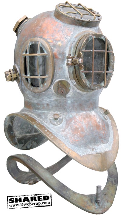 The danish 2 bolt divers helmet was invented by Peter Hansen Hessing. As a diver working for the danish salvage company ‘Svitzer’ he had learned to dive with the antique ‘Sadler’ diving equipment. The Sadler was in fact an open helmet with a jacket attached to it, based on the very first design of diving equipment. Peter Hansen Hessing used the Sadler helmet as the base for his own helmet and improved the design by giving it a breastplate which could be built to a ‘one piece’ suit with the use of a neck ring and 2 bolts. He patented his helmet in 1907, he never built any helmets himself but designed them and had them built by local craftsmen.