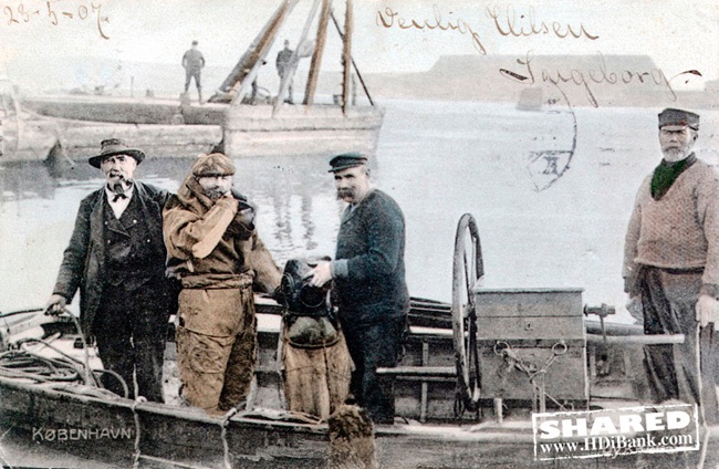The postcard here above shows Peter Hansen Hessing himself, in the harbor of Kopenhagen about to be dressed with the Sadler diving equipment (see also the chapter ‘Sadler’ on this website)
