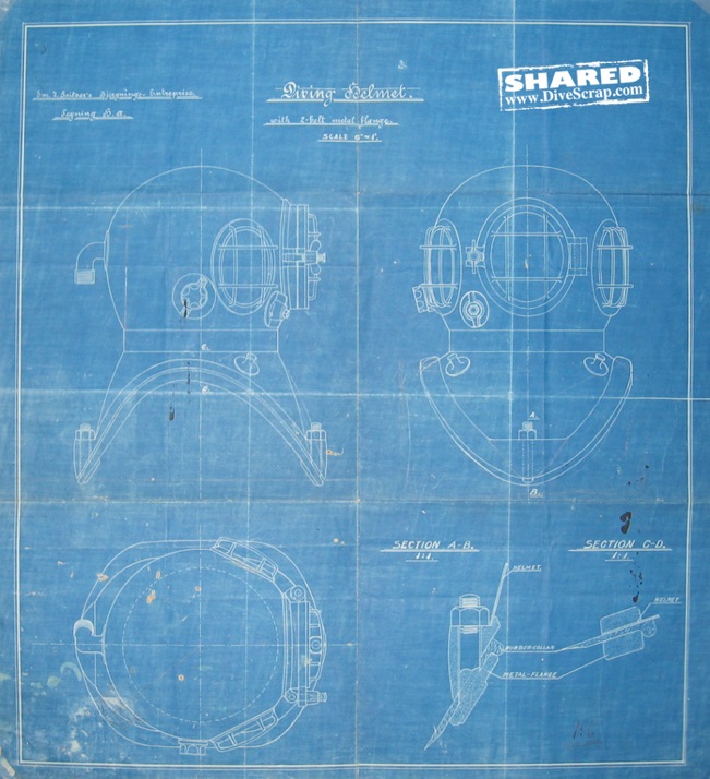 The original blue print showing the 2 bolt helmet design. Blue print collection Dykkehistorisk Selskab Danmark