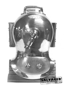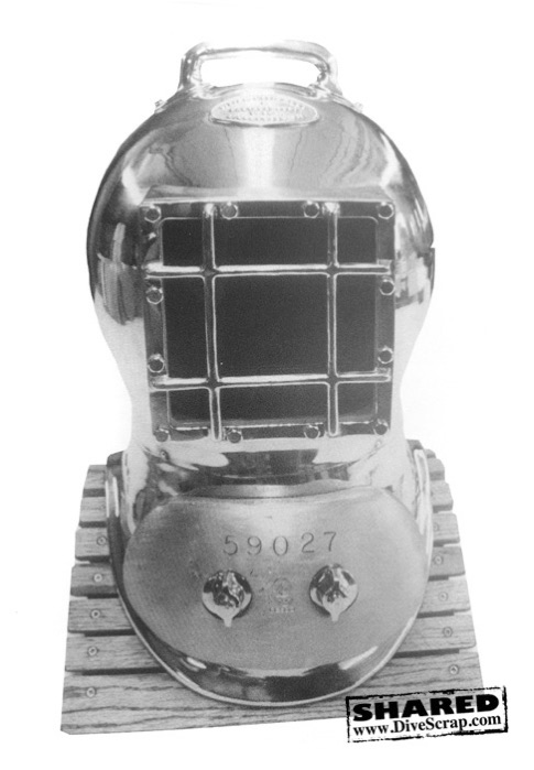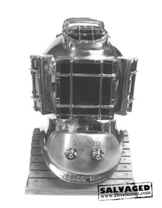The DESCO Shallow Water Helmet is the most basic design in our helmet line. It was produced for commercial use in the 1940's.The Shallow Water Helmet differs from other helmets in that the breastplate and top are permanently joined together. The helmet rests on the divers shoulders without being attached to a diving dress. The helmet is held in place by weight. Air is exhausted from the helmet by it escaping under the breastplate lip. It comes high polished and complete with front and back weights. The DESCO One Light Shallow Water Helmet has the standard square 6 3/4"x 7" front window. The top shell and breastplate are riveted and soldered together. The window is polycarbonate. It comes with two kidney weights held on with Mark V Flanged Wingnuts. The helmet is also equipped with a Navy Mark V Non-Return Valve. A cast handle is mounted on the top for carrying and to aid in donning. The nametag is the old cast "Diving Equipment & Salvage Co.", soldered to the upper rear of the shell. The original drawing of the DESCO Shallow Water Helmet with the cast breastplate ( currently available from DESCO ) is dated 9/3/1948, the original design only lasted about four years. ( images & info www.descocorp.com )