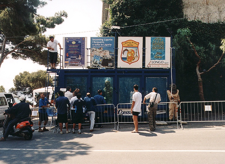 One small suggestion though. During the event there where a few brave who descended into the water in front of the Dyktankhuset. At the bottom however they found a it littered with huge rocks and (I was told) even all sorts of scrap metal. A true struggle especially for those who are not experienced. To avoid injuries you could consider to provide the public with an even more interesting scene. Myself I gave a hard hat diving demonstration in (Siebe Gorman) helmet diving equipment back in 1984 here in Hoorn, North Holland. Since the bottom of the harbor was dangerous and out of sight for the spectators we used a container with a glass window in it. See photo’s. Also during the International Underwater Film Festival in Ventimiglia, Italy (where a film I figured in was judged) such a container was used. See next photo’s. During the meeting in Turku also a (mini) container was used. See down below. Maybe the Swedish Historical Diving Society can get some sponsors together to finance a second hand sea freight container to be placed at the museum location?
