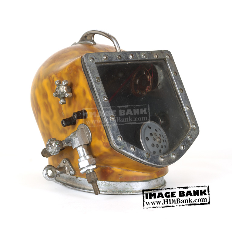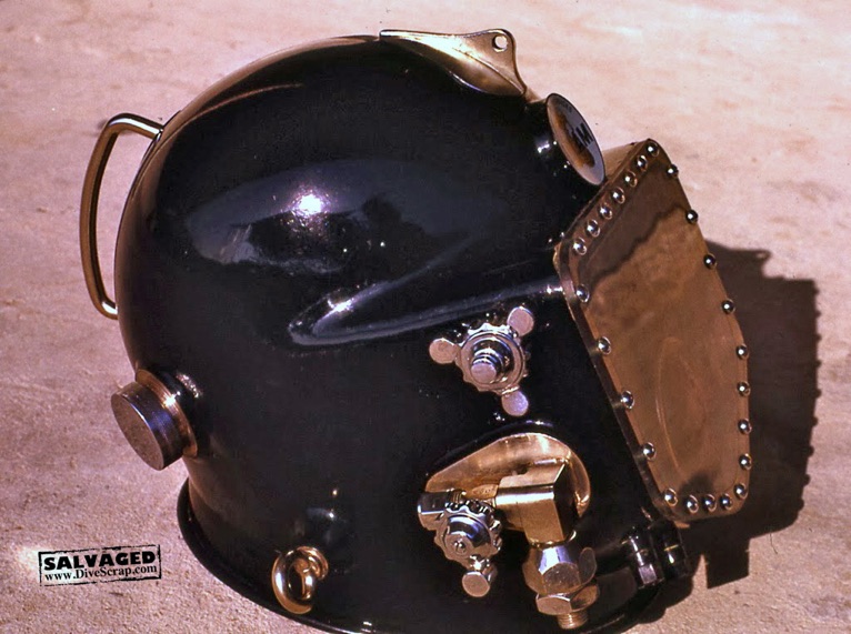 The second helmet shown here below, the yellow one, I bought several years ago in Sweden, and since the Swedish Navy Museum shows a helmet made by Kaj Undén ‘looking just like this one’ I had assumed that this helmet would have been made by the same man: Kaj Undén. (see Kaj Undén in the Swedish chapter) But after having this helmet filed in the Swedish chapter of this website for several years, an interesting link was sent to the websites mailbox yesterday, this link lead to a website in France where 2 men, René Duverne and Raymond Lamblin established a diving company which was called DULAM Diving Service. Apparently these 2 men built their own diving helmets, and when comparing one of them (the black helmet shown here below) with the helmet at the bottom of this page (from the Swedish chapter) there is enough resemblance to consider this helmet possibly also to be made in France by Duverne and Lamblin. We are currently trying to get more info on this helmet.
