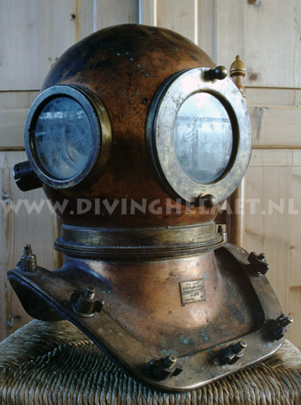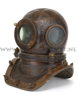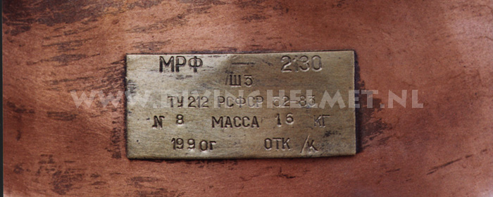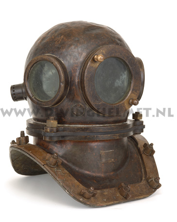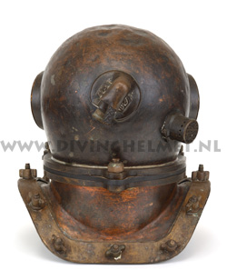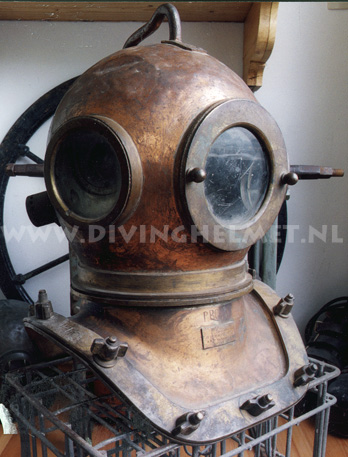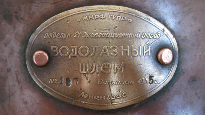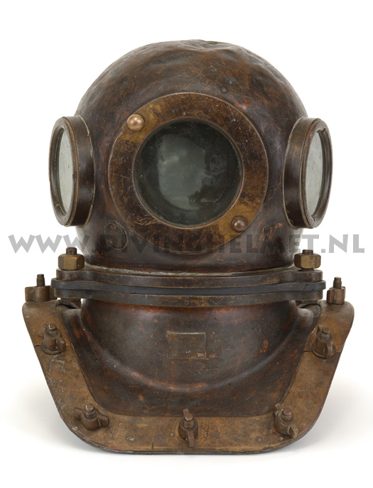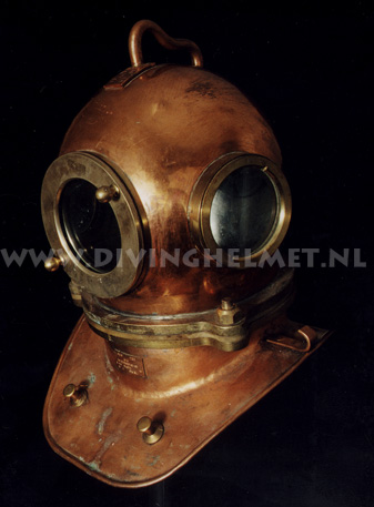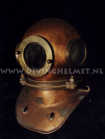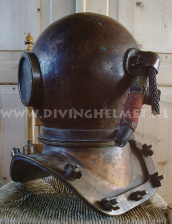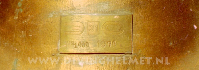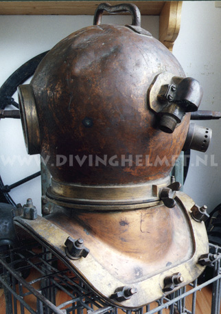 Above helmets: on the left is the 'UVS50' helmet ( no handle/hand-grip on top ) and on the right is the 'UVS50m' helmet ( with top hand-grip ) The bonnets of these helmets are identical to the bonnet of the Russian 12-bolt helmet which is much larger and more round in shape when compared to the bonnet of the Sja-3 and UVS50m helmet. Another feature of these civil helmets is the lacquered protection applied to the surfaces that is commonly found on German Draeger helmets. The Draeger helmets often have a thin layer of cellulose varnish which gives the metal a surface 'shine'. For some reason the hand-grip on top of the UVS50m helmets ( both on the 3-bolt version and on the 12-bolt version) is positioned in reverse to the back of the helmet when compared to the hand-grip on the helmets manufactured by Factory No.3 and Factory No.28. Photographs David L.Dekker.