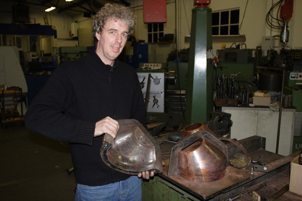After the main body of the mask was hard soldered into a ‘tube’ by Rob’s father, we placed it into a steel mould. After a day of hammering the result was one sore arm ( of the hammering ) and a perfectly shaped body for the mask. Photograph Rob Krul