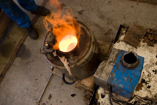 When the brass is at a temperature of almost 1100 degrees C then its liquid enough to be poured into the moulds Photograph David L.Dekker