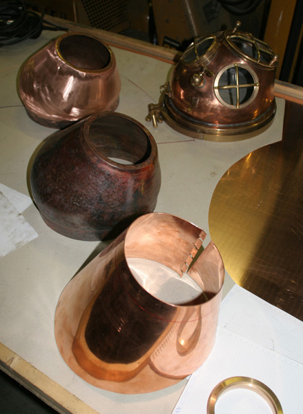 Not even 1 part which we needed to build the masks was available from any supplier, so each and every piece of it had to be manufactured. Also certain tools like the steel mould for the main body and the moulds for the brass parts had to be designed and built before we could start with the project. After nearly one year since we had ordered the first materials for the project we had finished the first mask. The photograph here above shows the evolution from the ‘rolled up’ copper plate into the final shape of the main body for the mask and at the background the mask all built together with the brass parts which either Rob had machined or we had casted with the help of my father. As joke I had sent the photograph here above to our friends in Denmark saying that the project advanced well and that we did no longer need their genuine mask: ‘when could we drop by to give them back their mask’? For a short moment it caused a slight panic with the danes who believed we had taken their genuine mask to Holland ... we took that as a compliment :o)