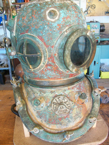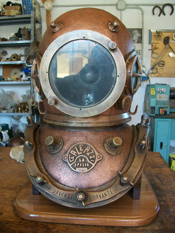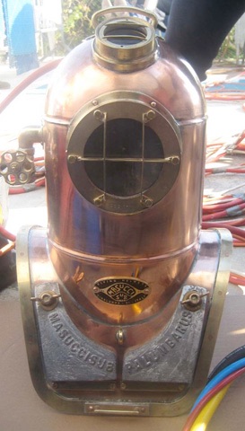 Masuccisub is a trade name established in 1997 by Maurizio Masucci. Back then he started the production of a full size 12 bolt diving helmet: the ‘Masuccisub’. Following this project a series of perfect scale models of diving helmets were built, these helmets deserve a place in the ‘art’ section on this website because you cannot dive with them. Since a couple of years Maurizio also manufactures ‘Shallow Water’ or ‘Open’ diving helmets.