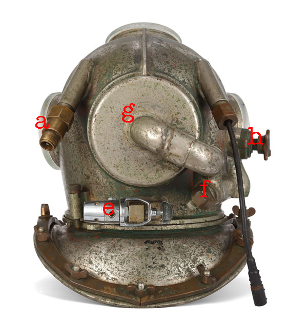 Divers would descend on air to 150 ft to save on expensive helium mixtures so during the first 150 ft of the dive normal air enters through non return valve a. This leads to valve b which regulates the flow of air into the helmet through a silencer/defogger (c) (inside the helmet) At 150 ft they would stop their ascent and the supervisor (at that time called manifold operator) would switch them to Heliox. They would still be on freeflow. They would be instructed to start counting out loud 1, 2, 3, etc, until their voice would change signifying that the umbilical has been flushed free of air and they are on the mixture. Than they would be instructed: 'recirculate, recirculate' and close the freeflow valve b which would direct the gas through valve d to the (first stage SCUBA) reducer e at the back of the helmet. Reducer e is driving the venture nozzle (injector) f (*) recirculating the gas in the helmet/dress. Then the diver tightens the exhaust valve h as far less gas (minimal) would be exhausted. The recirculating of the gas, called the ‘venture’ is done by injector f which shoots the gas past the injector pipe that comes out of the back of the scrubber (g) and there it creates a vacuum which sucks gas from the helmet and passes it through filter g which then re-enters, filtered en enriched with O2, in front side of the helmet where it defogs the faceplate.