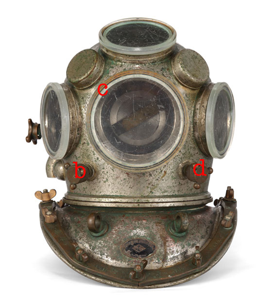 This helmet was last used by the Norwegian navy in 1984 to construct a submarine base at 150 meters of depth, when the job was done the helmet was given as a souvenir to the diver who had used it because it was to be replaced by a more up to date model. Photos David L.Dekker