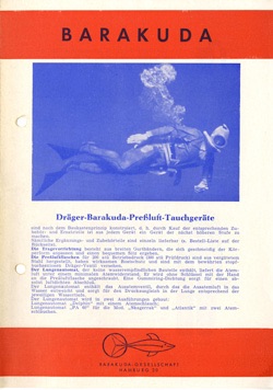 Soft cover 12 pages illustrated sales leaflet for Dräger Compressed Air SCUBA equipment which was sold under the brand name ‘Barakuda’. Not dated.