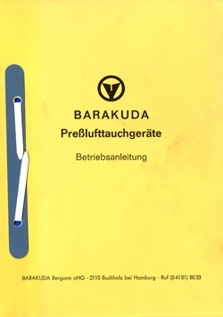 Soft cover booklet. 38 pages BW illustrations. Instructions manual for Dräger Compressed Air SCUBA equipment which was sold under the brand name ‘Barakuda’ .