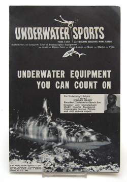 Sales catalog of Undersea Sports. Photo equipment, masks, snorkels, tanks, suits, harpoon, compressors etc. etc. as well as genuine ‘treasure maps’ ... ( ...‘make the sport pay for itself’ ... ) 15 x 22, 24 pages