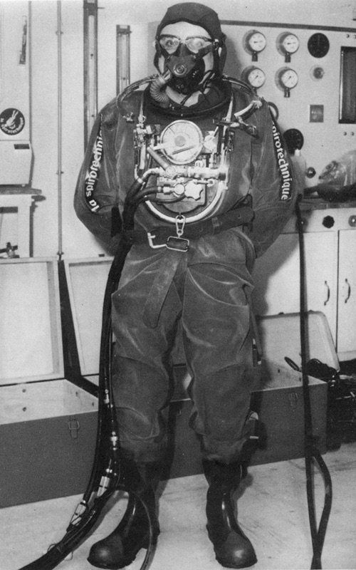 Initially the La Spirotechnique system was used with either a dry suit with an electrically heated under suit or even with a wet suit. But in 1982 the swiss scientist Hannes Keller joins La Spirotechnique to assist them to develop a new suit for it: a suit which can be heated with hot water. Later these suits would be manufactured by ‘Diving Unlimited’ of San Diego, California USA