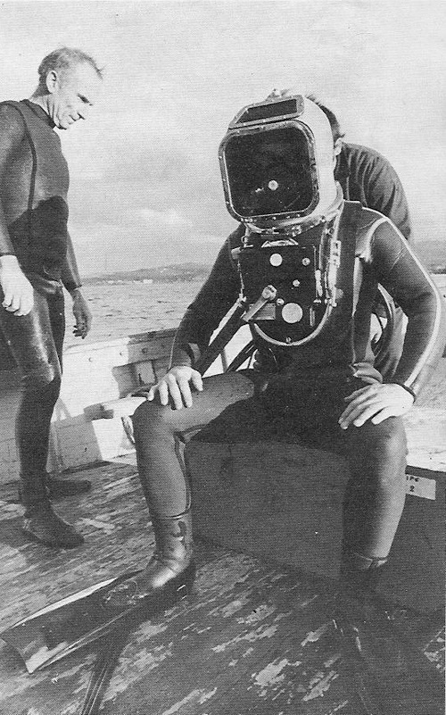 The photographs above show the second version of the EIP5 helmet with a square faceplate. At this helmet the large square faceplate now has chromed frames around the windows. I assume that this is the last and final version of the EIP5 helmet. Interesting detail: the breastplate is fitted with an adaptor bag which covers the inside of the breastplate and has a neck seal so the diver can wear a standard wetsuit. Photograph: scanned from the french magazine ‘L’avonture Sous-Marine’.