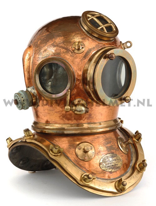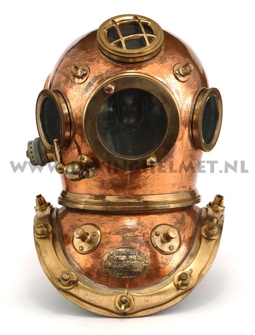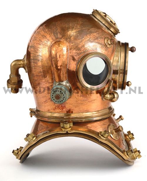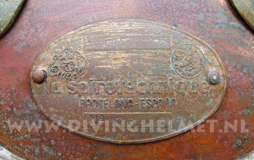 The supplier of standard diving equipment to the Spanish Navy, was Joaquin Carbonell Gimeno, S.A. of Barcelona. It is believed that he manufactured diving helmets for the navy since the early nineteen forties. Somewhere in the nineteen fifties he became importer and dealer for La Spirotechnique. I have not been able to find out the exact story but around 1980 the 12 bolt Carbonell Gimeno helmets were advertised in the french magazine ‘L’avonture Sous-Marine’. These helmets were not carrying a Carbonell Gimeno badge, but instead they had a badge marked ‘La Spirotechnique, Barcelona’ on them. Some claim that these helmets were manufactured in the nineteen sixties as decoration pieces to be displayed in the shops of La Spirotechnique diving equipment retail sellers, but I have not found any evidence for that. In the mid nineteen nineties I visited a nautical antiques dealer in the center of Madrid who had 7 or 8 of these helmets in stock. They were all in new condition but the company badges had been removed. When I asked him about it he showed me a La Spirotechnique badge which could be riveted to the helmet. At the time the lot was to expensive for me to buy and when I returned about 1 year later they had all disappeared. To me the exact story behind these helmets is a bit of a mystery ... The helmet at the photographs here below I found last year in Spain. Photographs David L.Dekker