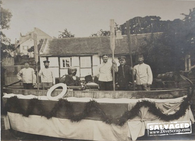 A wooden cart dressed up as a boat, a ‘diver’ wearing a cooking pot as a helmet but complete with a weight and a large buffer tank with reducer valve. I wonder if this helmet was diveable but the cart was built for a carnival parade somewhere in Germany in the first half of the 20th century. The back of the photograph is marked ‘Etyel Holzhandlung Fisschergasse’ ( Etyel wood company, ‘Fisschergasse’ is a street name ) When you know more about this picture, the wood company or the Fisschergasse then please let us know. Thanks.