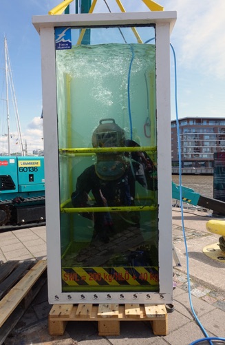 One small suggestion though. During the event there where a few brave who descended into the water in front of the Dyktankhuset. At the bottom however they found a it littered with huge rocks and (I was told) even all sorts of scrap metal. A true struggle especially for those who are not experienced. To avoid injuries you could consider to provide the public with an even more interesting scene. Myself I gave a hard hat diving demonstration in (Siebe Gorman) helmet diving equipment back in 1984 here in Hoorn, North Holland. Since the bottom of the harbor was dangerous and out of sight for the spectators we used a container with a glass window in it. See photo’s. Also during the International Underwater Film Festival in Ventimiglia, Italy (where a film I figured in was judged) such a container was used. See next photo’s. During the meeting in Turku also a (mini) container was used. See down below. Maybe the Swedish Historical Diving Society can get some sponsors together to finance a second hand sea freight container to be placed at the museum location?