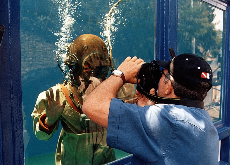 Myself in 1984 being dressed before giving a hard hat diving demonstration in a mini container with windows back in 1984 in Hoorn, North Holland