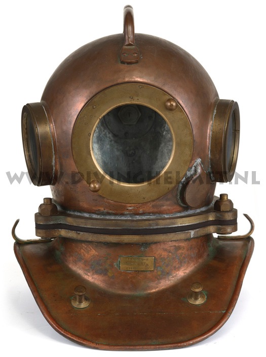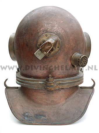 The 'BR' helmet shown above is equipped with a gear system which allows the diver to unlock the helmet by himself using a wrench on the hexagonal bolt protruding from the front of the breastplate. The locking ring would then turn and the helmet would become unlocked all round at the same time. Considering the fact that only one such helmet is known to exist it is unlikely that this helmet was built in any number. Helmet Leon Lyons collection, St Augustine, Florida. Photographs David L.Dekker.