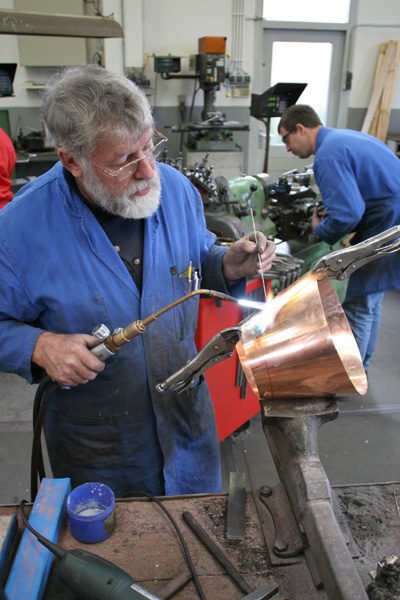 Above: Rob’s father hard solders the main body of a mask. Photograph David L.Dekker