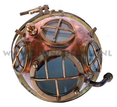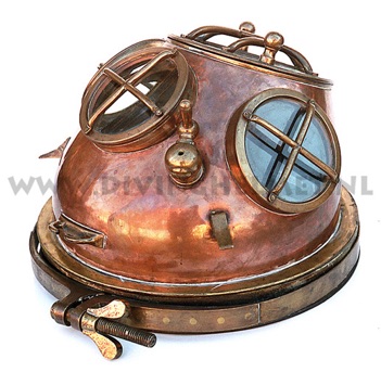 This time I discovered that the snout is probably one of the most inconvenient devices ever designed to explore the sea with. It is a heavy and clumsy thing which wants to fall off your face and onto the chest all the time, putting a lot of strain on the hose inside with the mouthpiece. Another negative comes when you realize that if you lose the mouthpiece inside the mask you can’t reach inside to grab it. My dive with the snout did not last very long. When I explained my experience to Muriel Peissik, of the ‘Museum du Scaphandre’ in Espalion, France she told me that in the museum they have a letter written by the French navy to Rouquayrol and Denayrouze explaining that even though they were quite impressed by the quality of the equipment, the mask was "quite inconvenient": would it be possible to change the design? The result was that the snout mask was given a 'back,' making it into a helmet. To suit the helmet a shoulder piece, or breastplate, was constructed. The helmet and shoulder piece were joined together by a flange with three bolts allowing the collar of a suit to be clamped in between, providing a watertight seal. The 3 bolt helmet was thus born. And when you take a look at early 3 bolt helmets it is easy to see the 'snout' in it, especially with the early Charles Petit helmets and also with Draeger helmets. This 3 bolt design became a new standard over most of Europe and even today 3 bolt helmets are manufactured in Russia and China.