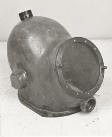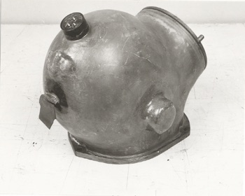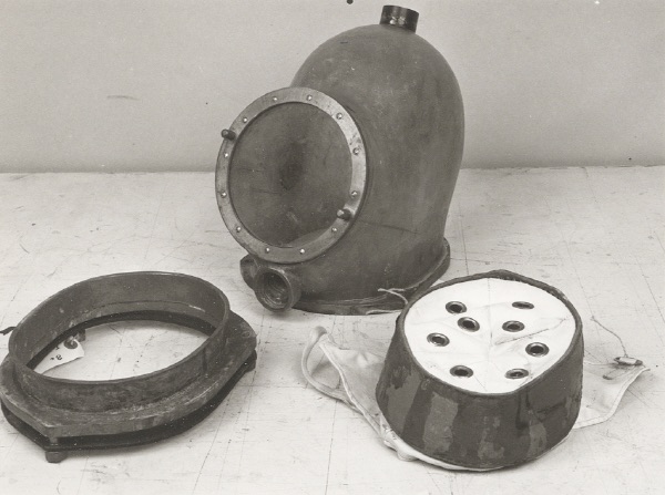 The helmet shown at the black and white photographs here below was made in 1956 as a prototype for a mix gas diving helmet. The constructor of the helmet was Kaj Undén who worked for the ‘Karolinska Institute’ in the nineteen fifties. This helmet is now in the possession of the Karlskrona Navy Museum.