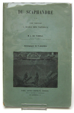 M. L. du Temple. Soft cover book. 30 pages plus a colored litho as a ‘center fold’ and a large fold out engraving in the back. This is a Diving Manual explaining how to use the Cabirol diving apparatus on board of ships.
