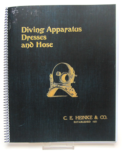 C.E. Heinke & Co., circa 1900. Diving Apparatus, Dresses and Hose. 4th ed. C.E. Heinke & Co., 79 Great Portland Street, London W. 60 pages. (Dark black-green cloth covered board with gold titling and gold outline illustration of a Heinke helmet on the front).