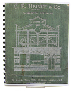 C.E. Heinke & Co., circa 1908. Illustrated Catalogue of ‘Diving Apparatus, Dresses and Hose’ 4th and 5th eds. C.E. 55 pages. Heinke & Co., 87, 88 and 89 Grange Road, Bermondsey, London, S.E. (Green cloth covered board illustrating C.E. Heinke shop-front premises depicted in white outline).