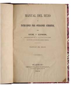 Siebe Y Gorman. 1883. Manual Del Buzo E Instrucciones Para Operaciones Submarinas. Madrid: Imprenta De Fortanet. (Spanish edition). 64 pages and 16 plates.